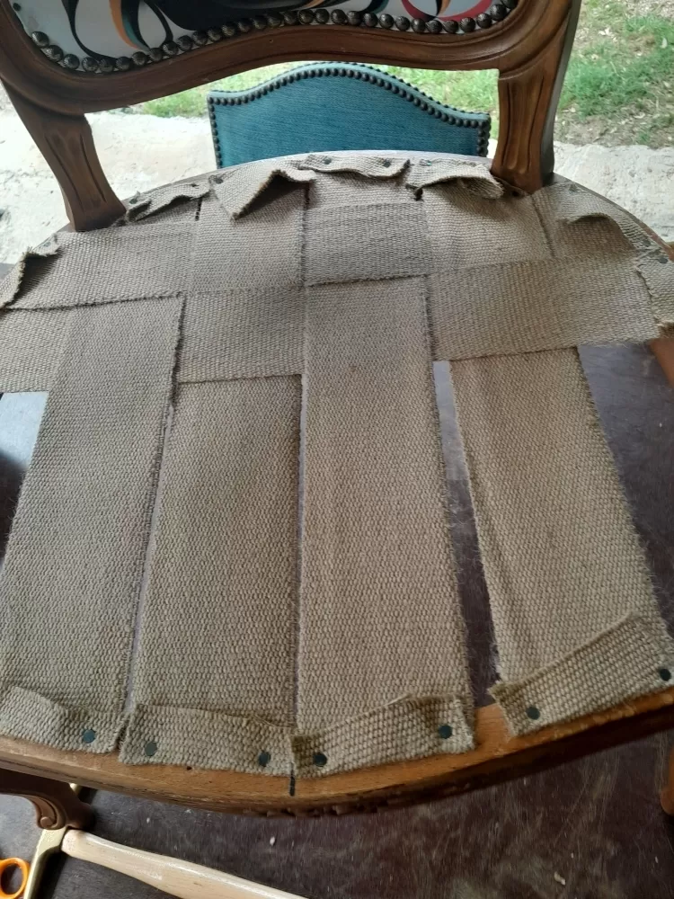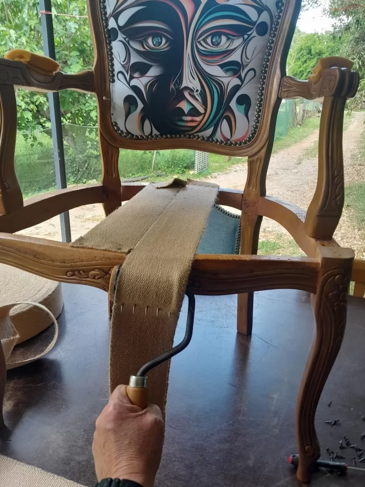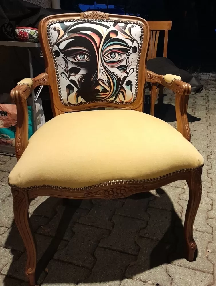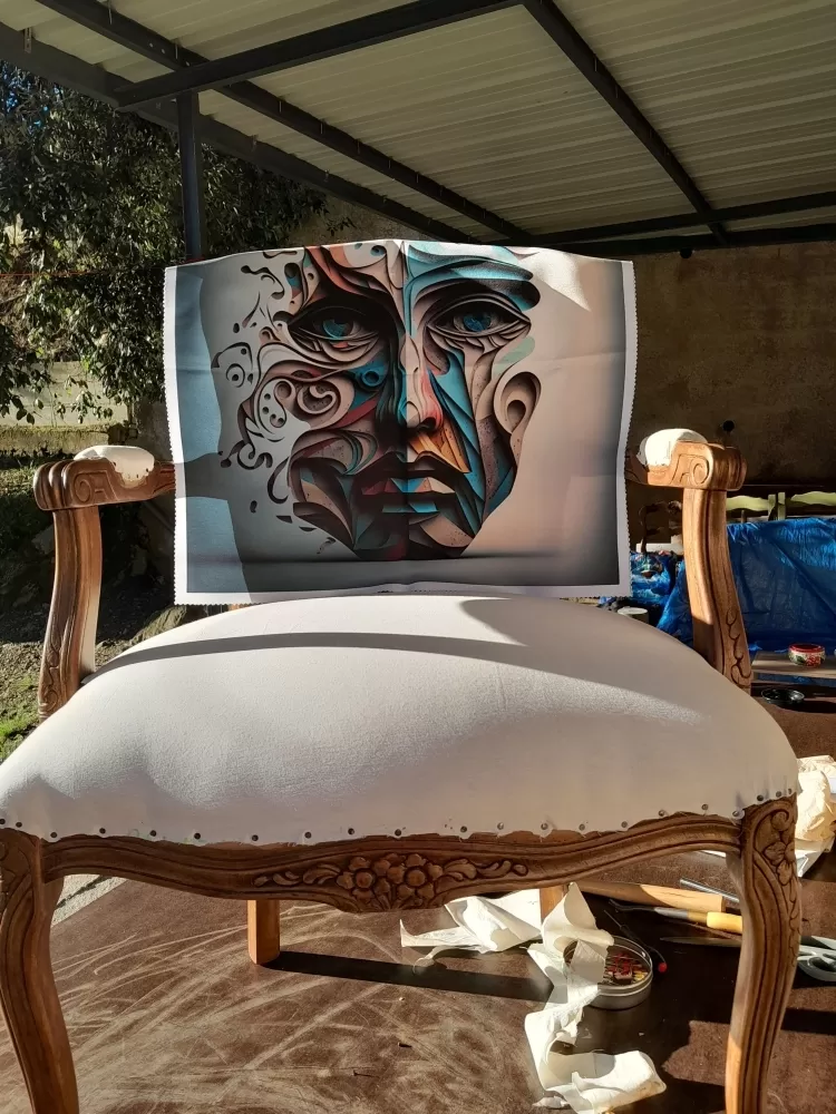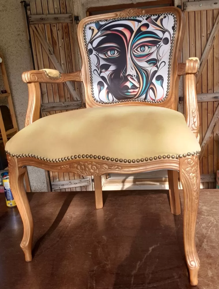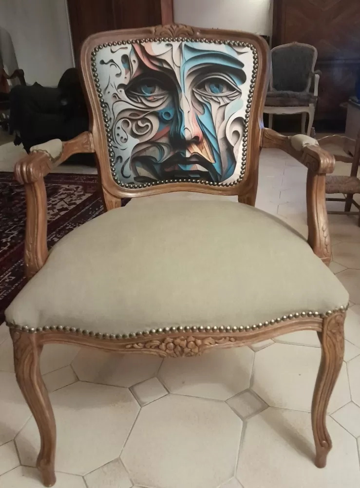 Les assises et les dossiers sont refaits entièrement, masques surréalistes imprimés sur le dossier intérieur.
