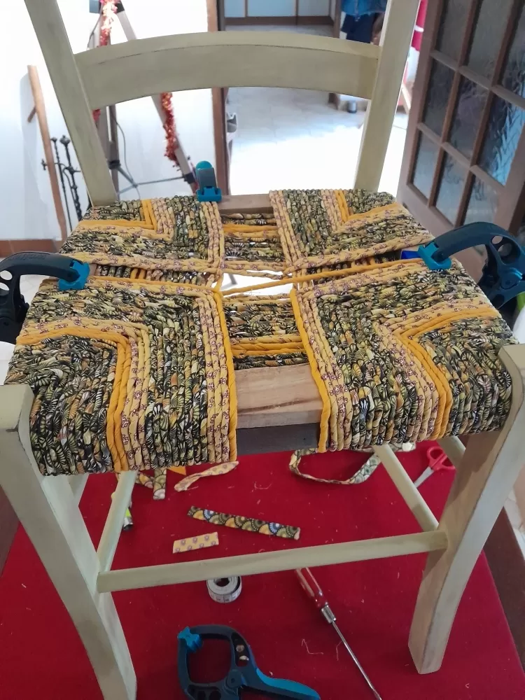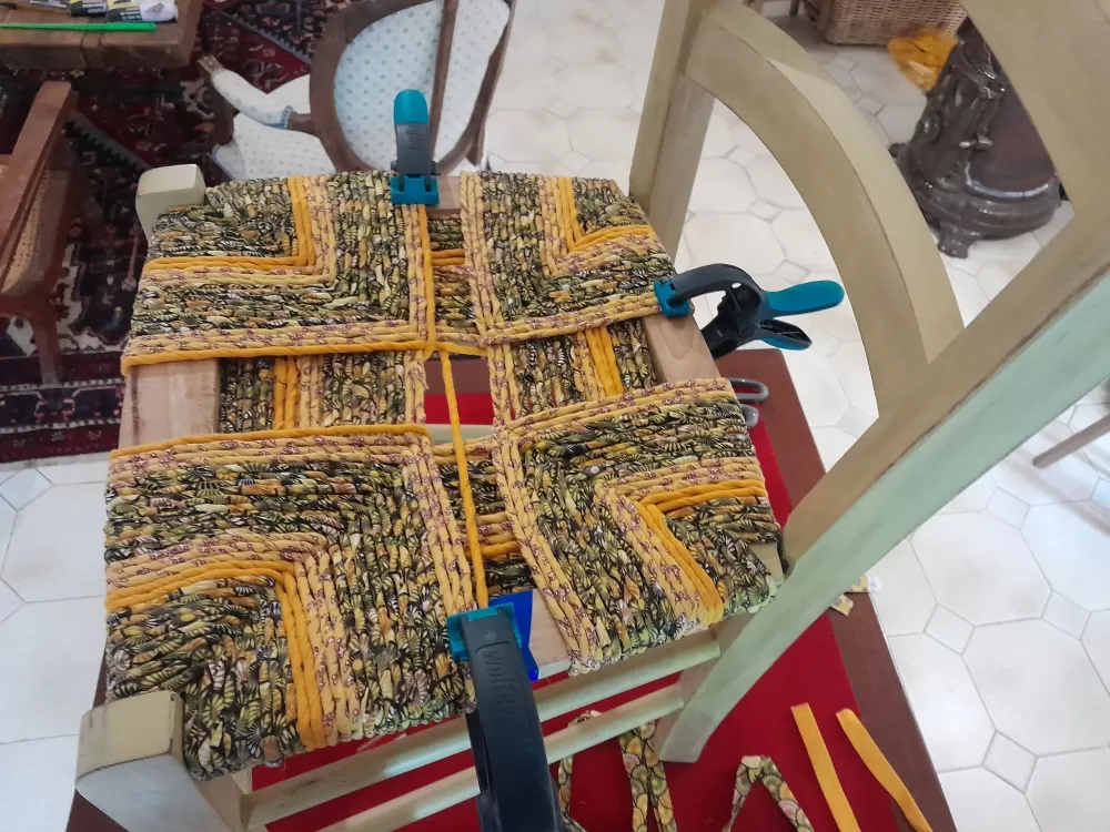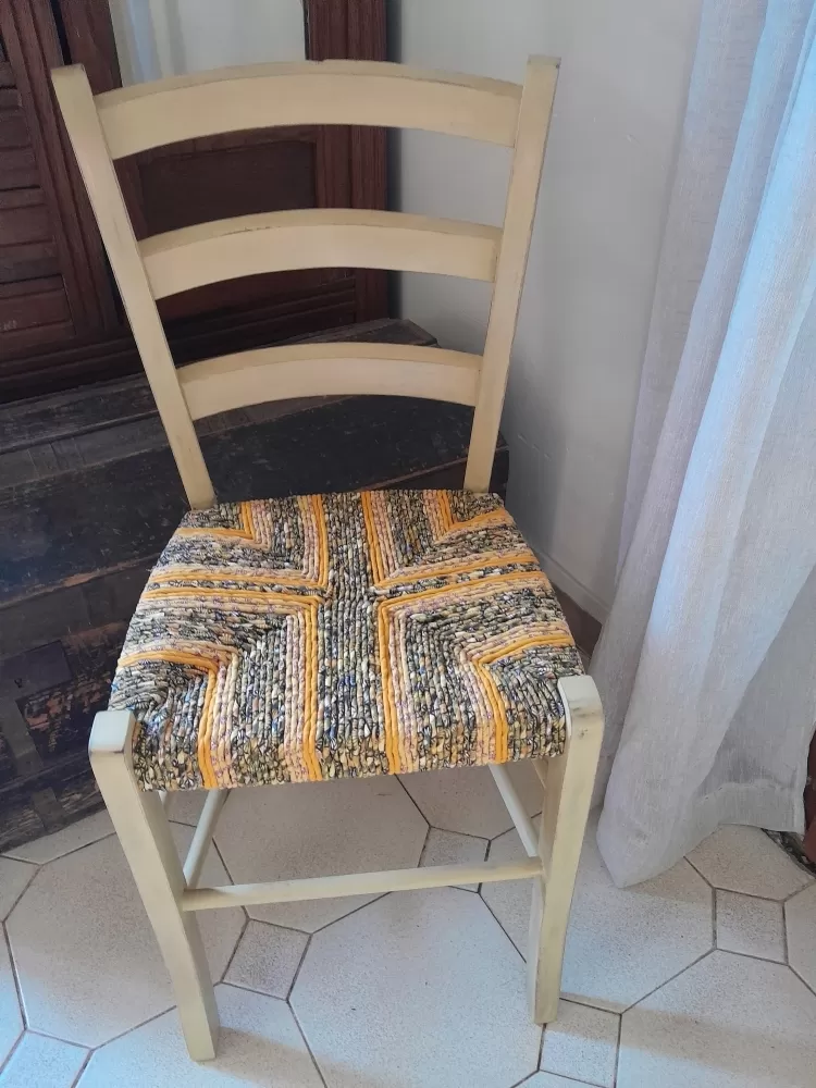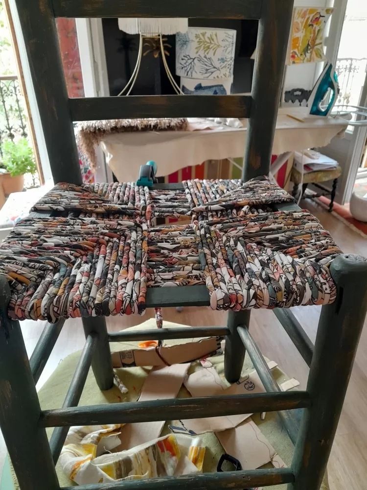 Votre tapissier d'ameublement à Corte vous invite à donner un coup de peps à vos vieilles chaises paillées en mélangeant des tissus colorés pour remplacer la paille.